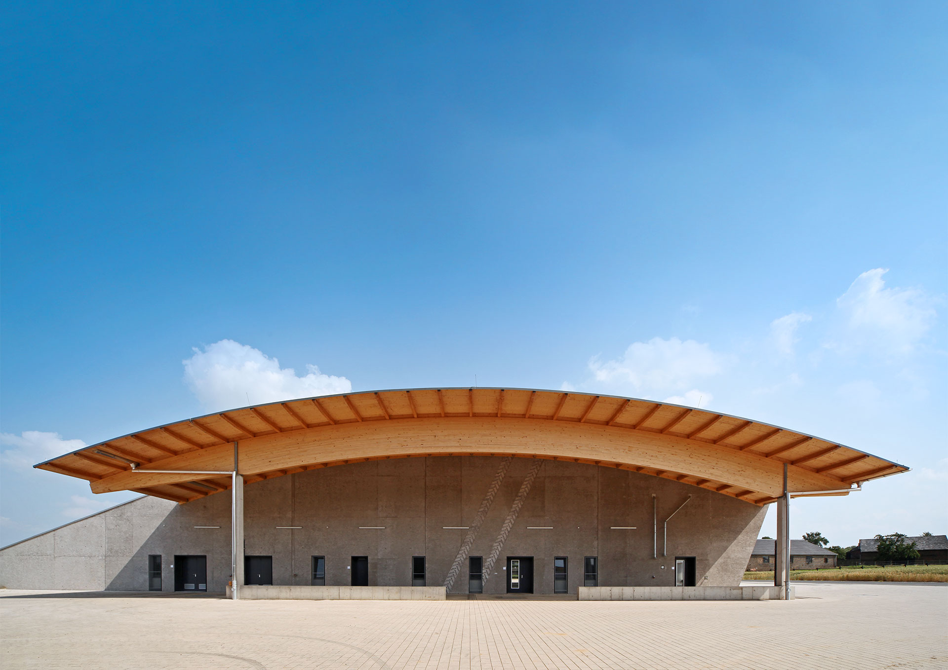 Projektbeschrieb: Mit :agrohort entsteht auf Klein-Altendorf ein so genanntes Science-to-Business Center. Es geht hier um die nachhaltige Energieversorgung und die Anpassung an den Klimawandel bei der Produktion von Nahrungs-pflanzen. Die pure, unverfälschte Beton-Ästhetik stand beim Bau der neuen Werkstatt- und Maschinenhalle des Campus Klein-Altendorf im Vordergrund. Die charakteristischen halbrunden Wandscheiben wurden deshalb massiv und ohne zusätzliche Wärmedämmung aus Liapor Leichtbeton in Sichtbeton-Optik gefertigt. In die Außenwände eingebrachte Traktorspuren stehen dabei für die agrartechnische Nutzung des Objekts.