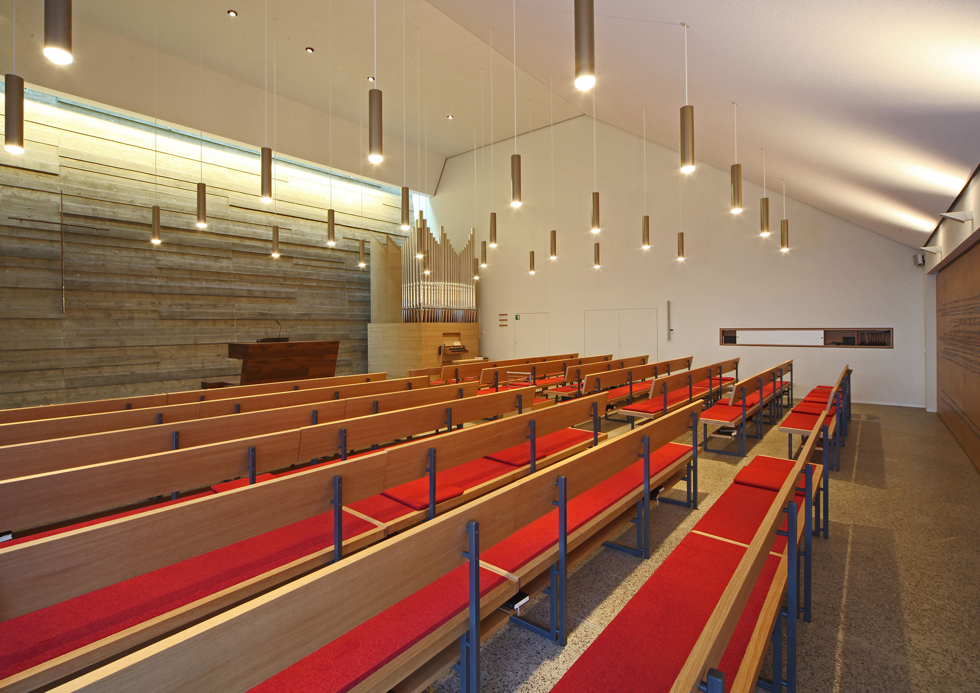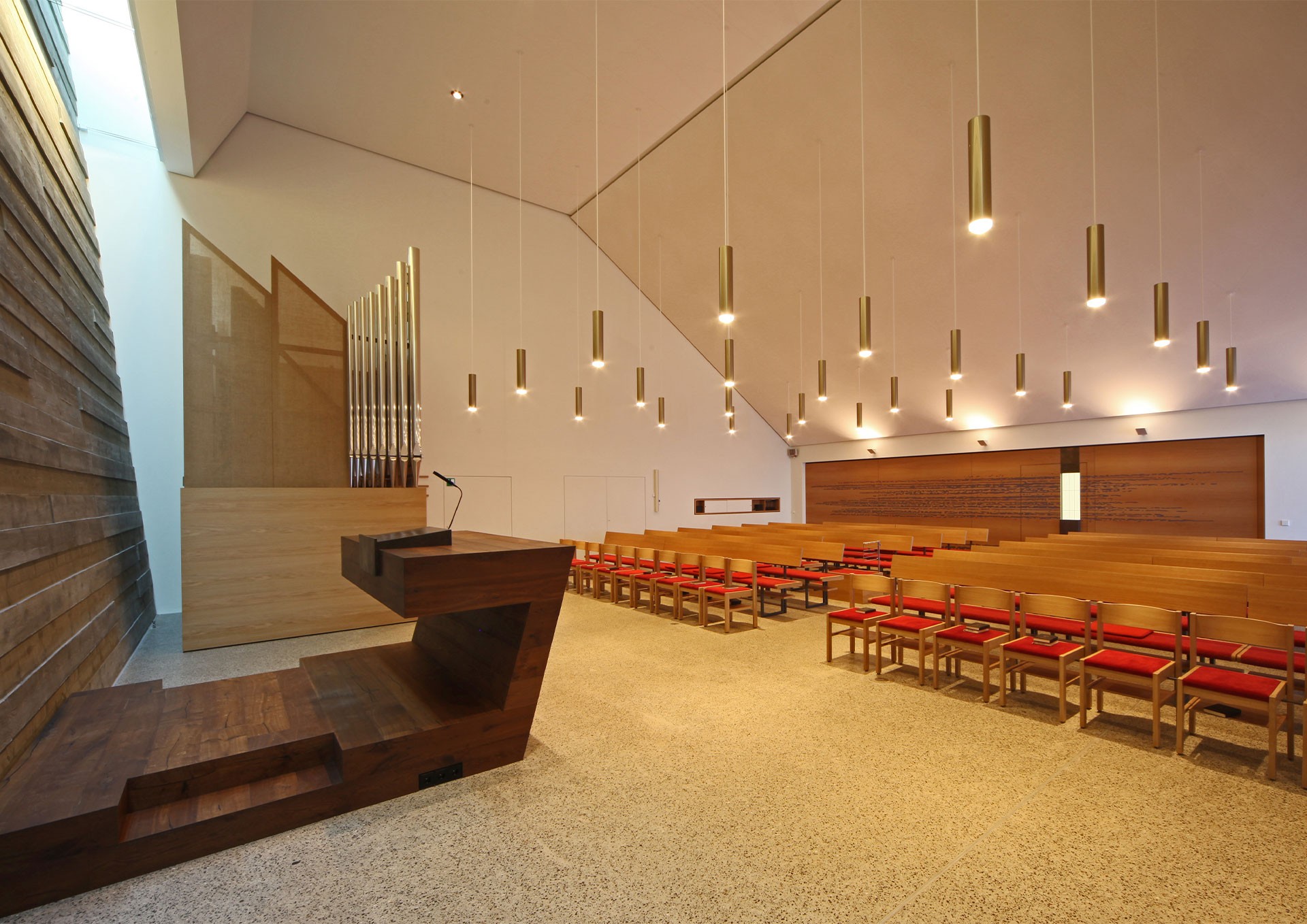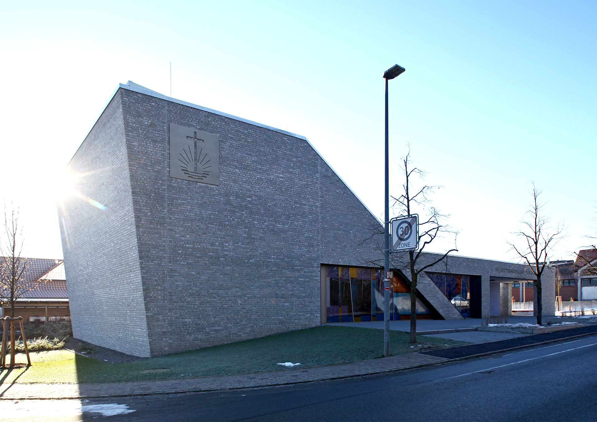 Projektbeschrieb: en. Der Neubau fügt sich in sein heterogenes Umfeld. Die Erscheinung ist zurückhaltend und klar. Der Baukörper wächst im Bereich des Kirchensaales in die Höhe – es wird so ein signifikanter Hochpunkt gesetzt, der als baulicher Solitär einen unverwechselbaren Ort geschaffen hat und der Kirche eine expressive Außenwirkung verleiht.