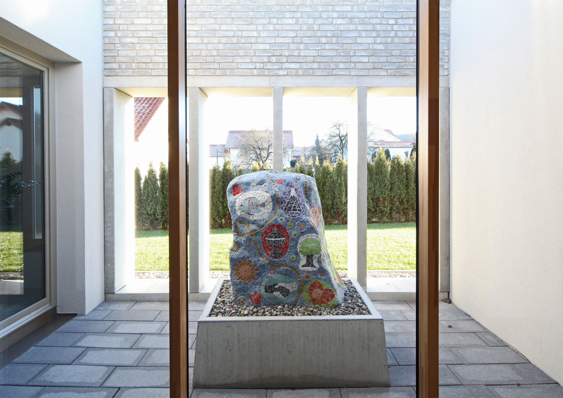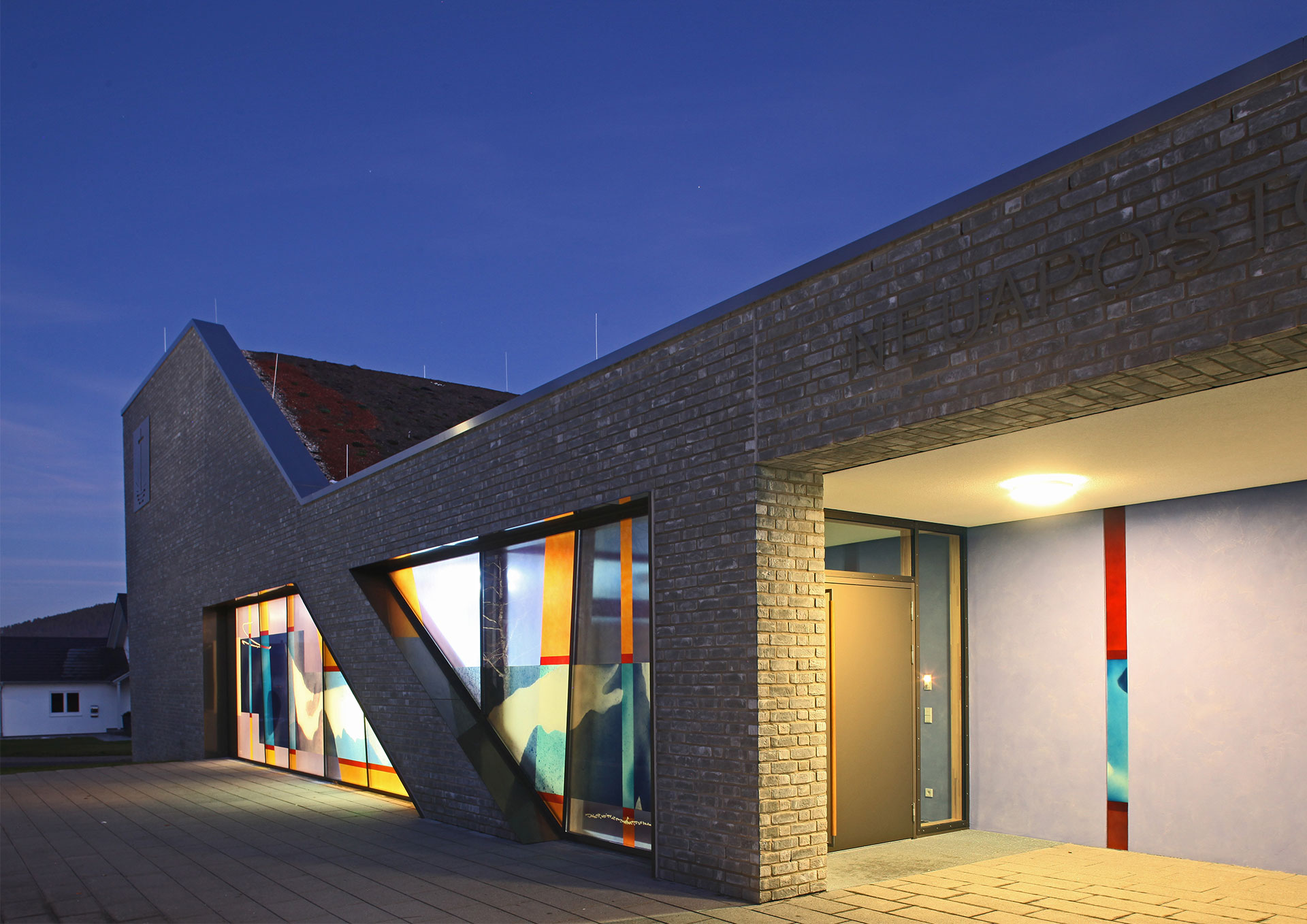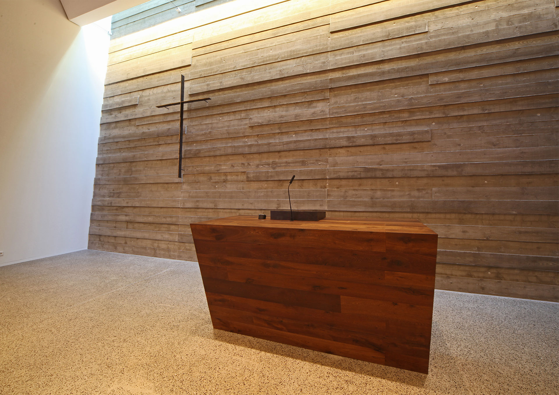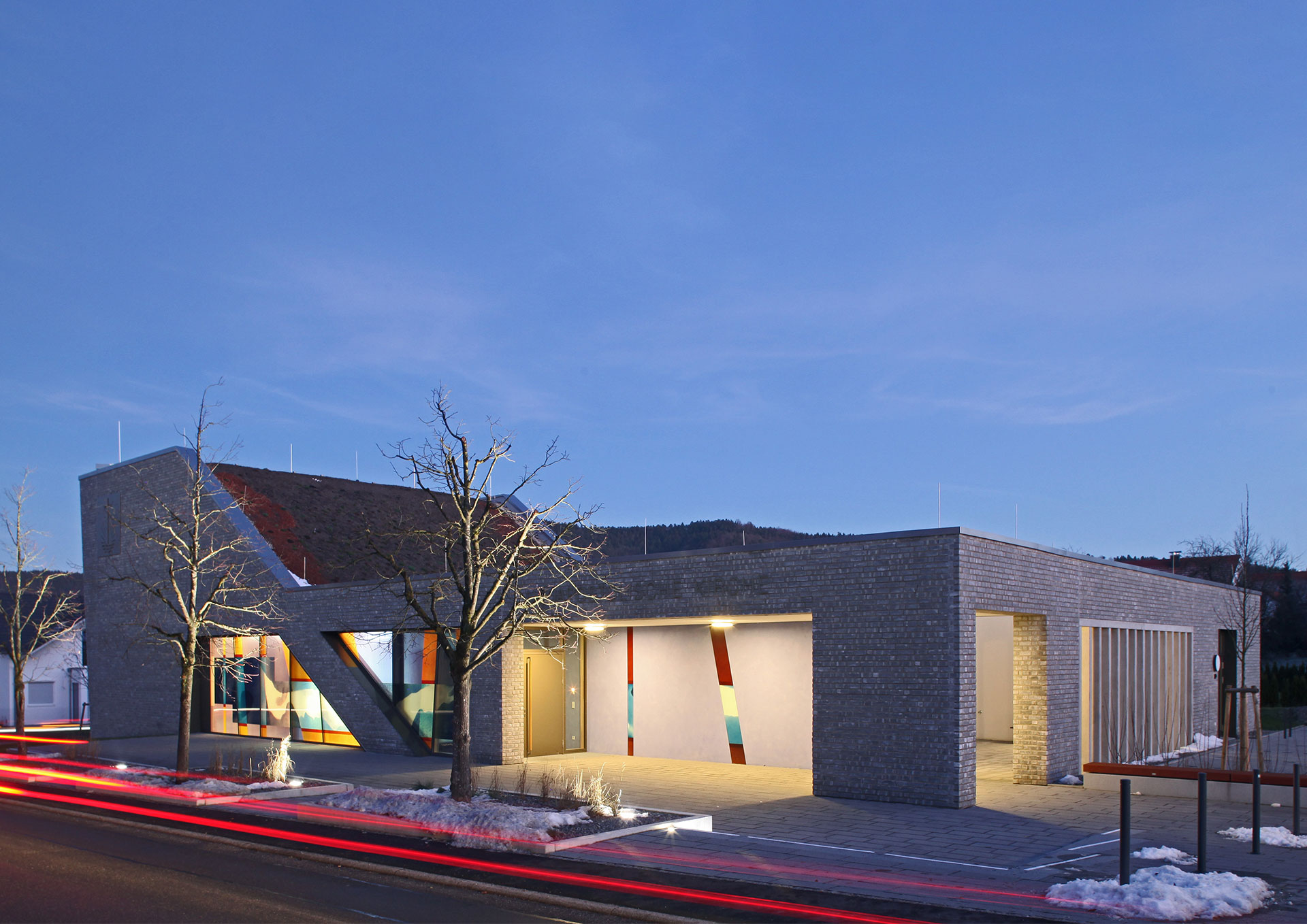 Projektbeschrieb: en. Der Neubau fügt sich in sein heterogenes Umfeld. Die Erscheinung ist zurückhaltend und klar. Der Baukörper wächst im Bereich des Kirchensaales in die Höhe – es wird so ein signifikanter Hochpunkt gesetzt, der als baulicher Solitär einen unverwechselbaren Ort geschaffen hat und der Kirche eine expressive Außenwirkung verleiht.