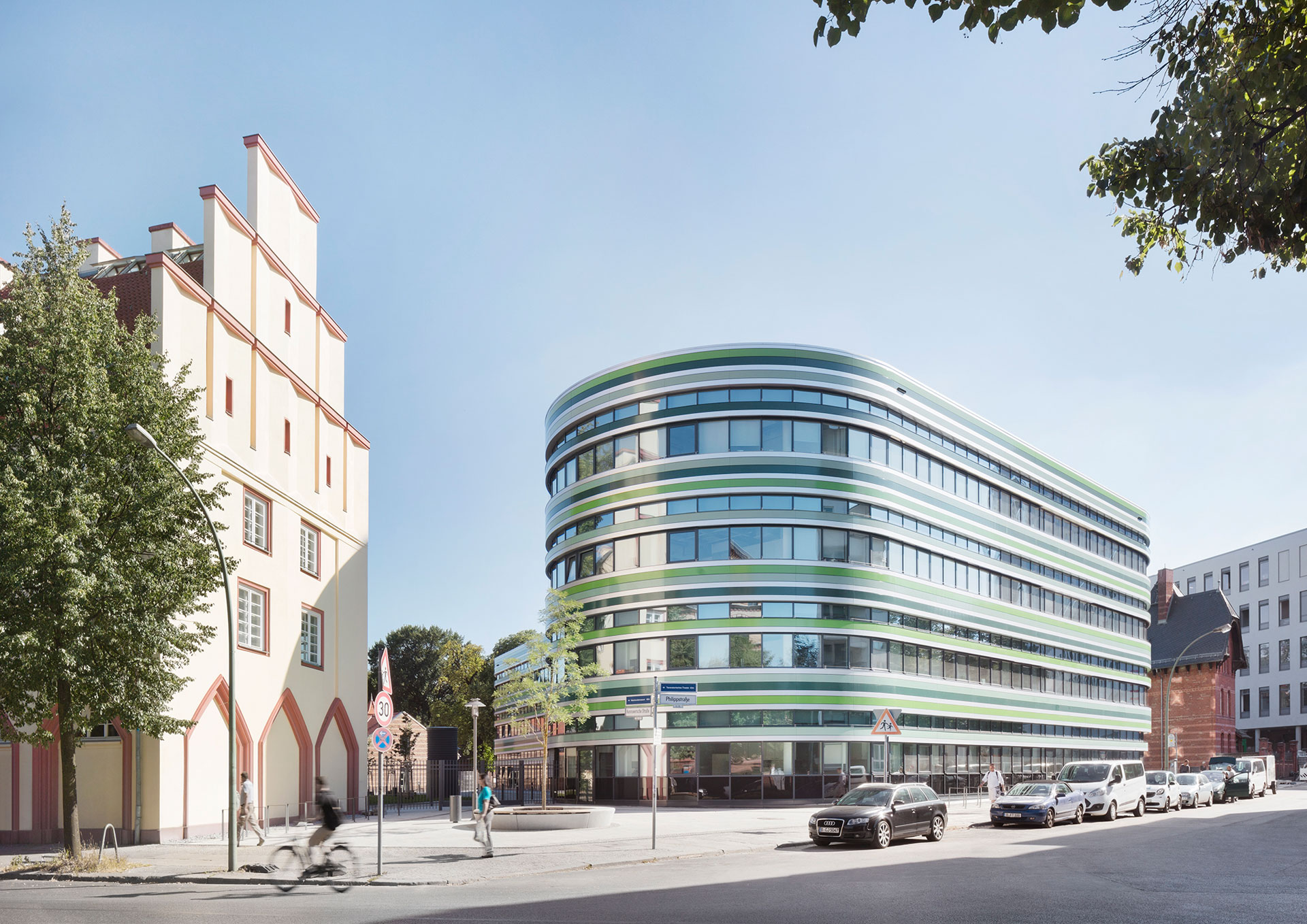 Regula Lüscher, Senatsbaudirektorin: Der Entwurf stellt sich als eine „geschickte Baukörpermodulation, die den Spagat zwischen einer Quartiersschließung und einem Campus-Baukörper schaffe, dar. Er setzt das hohe Bauvolumen in einer kompakten Bauform um und schafft es mit einer Staffelung der Geschosse von vier auf drei eine selbstverständliche Vermittlung zur umliegenden Bebauung herzustellen. Der Entwurf folgt konsequent den alten Quartiersgrenzen.