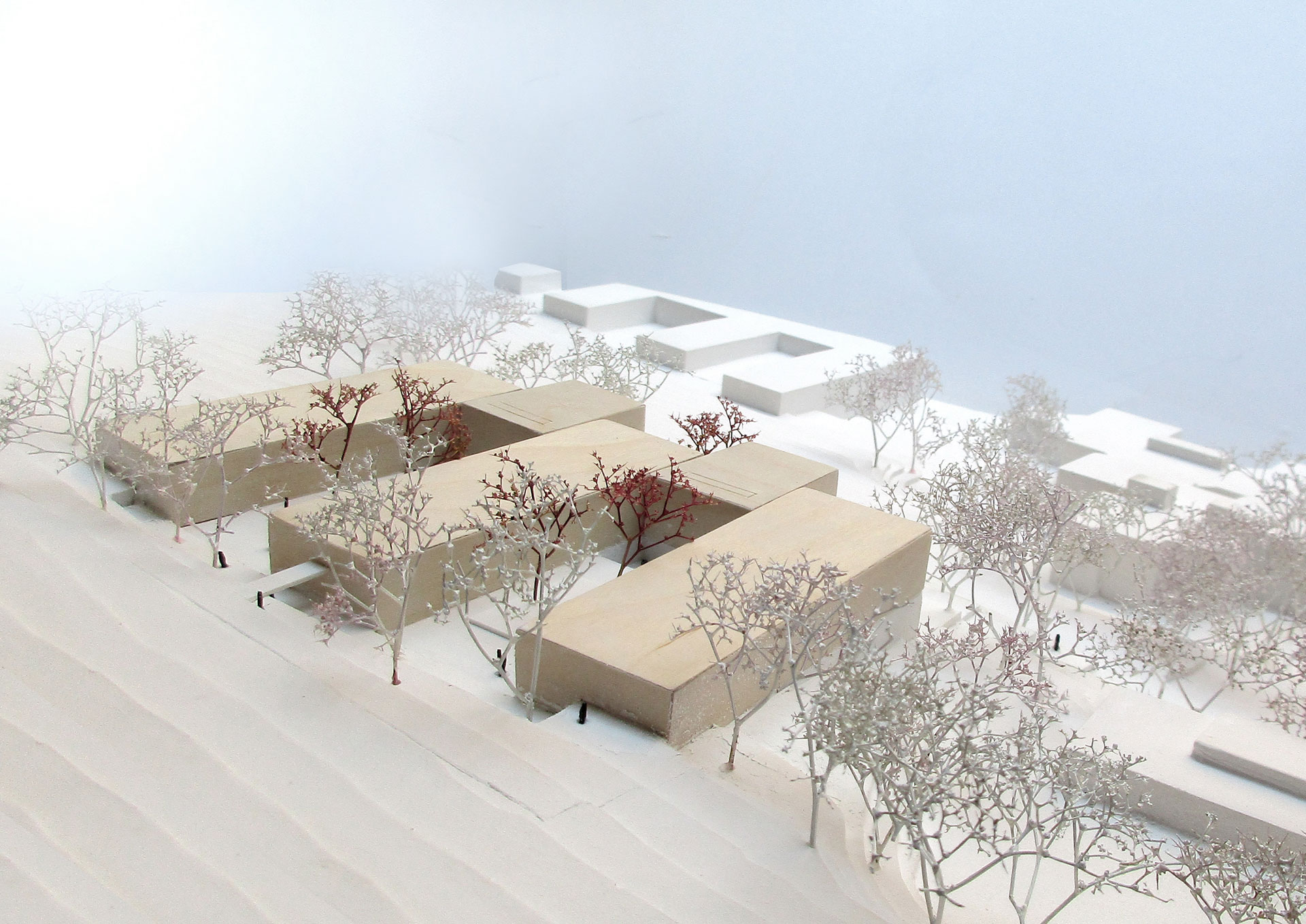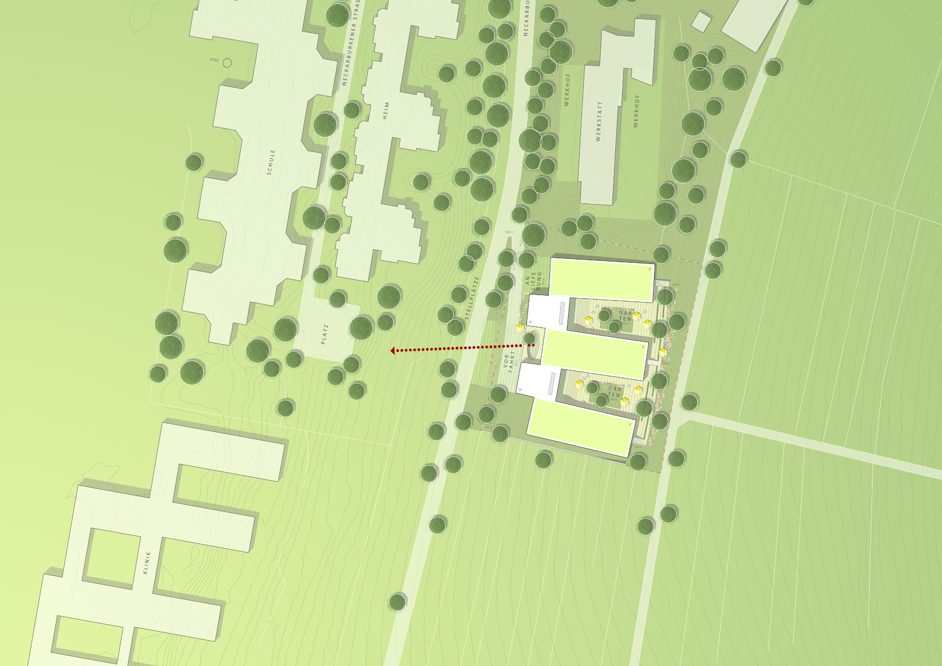 Zwei dreigeschossige Gemeinschaftsbauten schieben sich Richtung Westen vor die Gebäudeflucht in die unverbaubare Aussichtsituation und sorgen durch den zentral ausgebildeten Eingangsbereich mit großzügiger Vorfahrt für eine einladende Adressbildung.