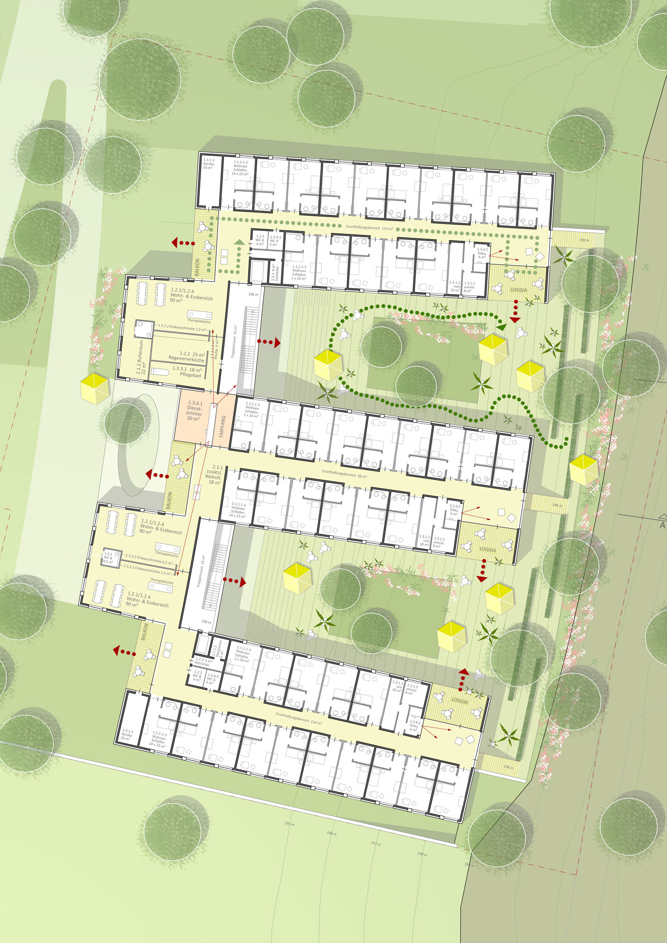 Alle Wohngruppen erhalten einen westlichen, zum Landschaftspanorama orientierten Gemeinschaftsbereich und einen östlichen Aufenthaltsbereich mit Kontakt zum Garten. Aufweitungen an den Flurenden ermöglichen hierbei ein rundgangähnliches spazieren zwischen den beiden Verweilzonen.