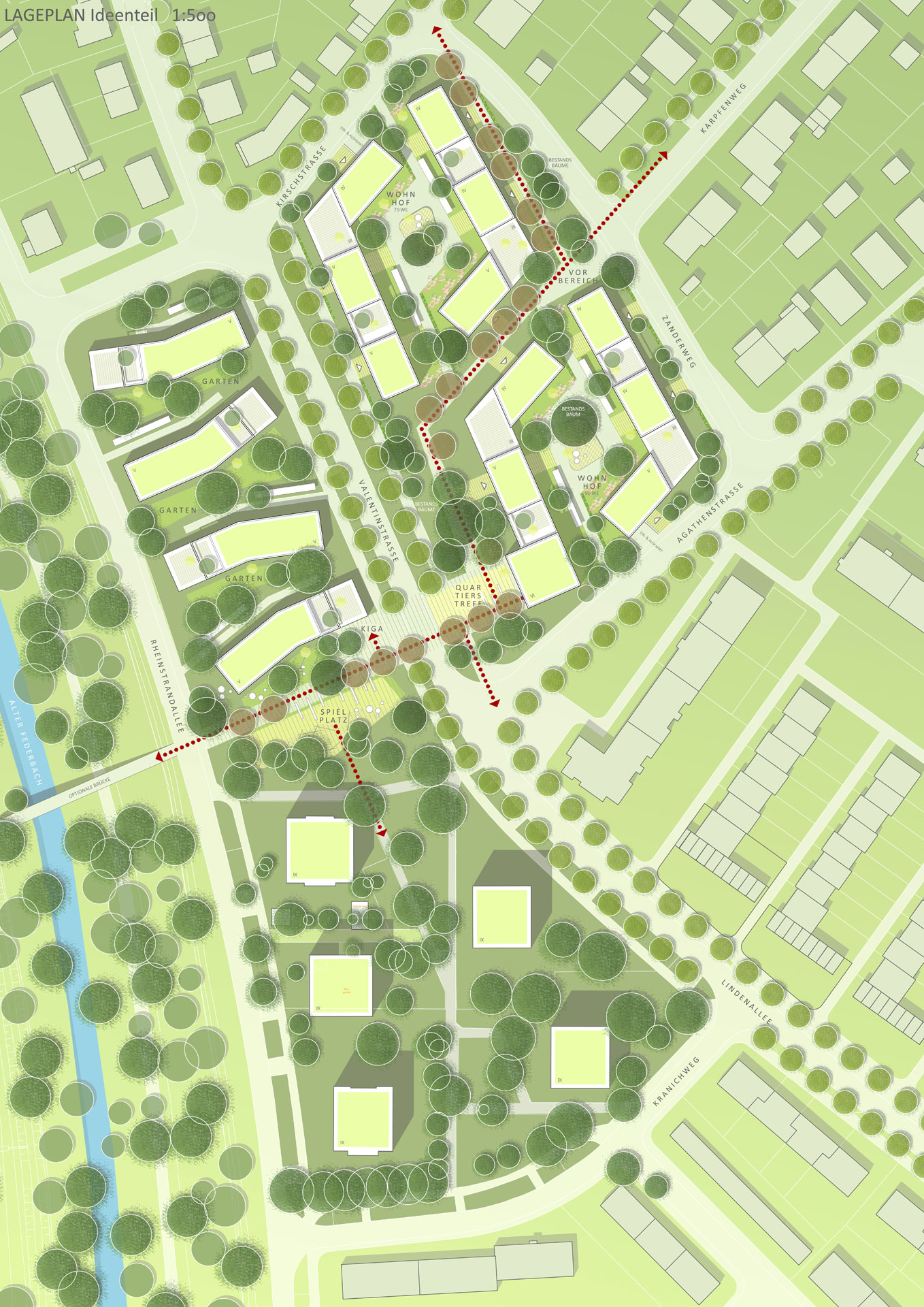 Die städtebauliche Grundkonzeption mit an den Straßen orientierten, gewinkelten Blöcken um jeweils einen Innenhof wird als richtige Setzung anerkannt. Die Stärkung der Kante zur Valentinstraße mit der höheren Bebauung und die gesamte Höhenstaffelung und Dachlandschaft wird als richtige städtebauliche Reaktion auf die Umgebung gesehen. Die höheren Gebäude im Quartier bilden einen markanten Mittelpunkt an der Durchwegung. Der Auftakt des Wohnquartiers an der Kreuzung Agathenstraße / Valentinstraße wird geschickt mit einem höheren Gebäude betont und mit Quartiersplatz zusätzlich gestärkt.