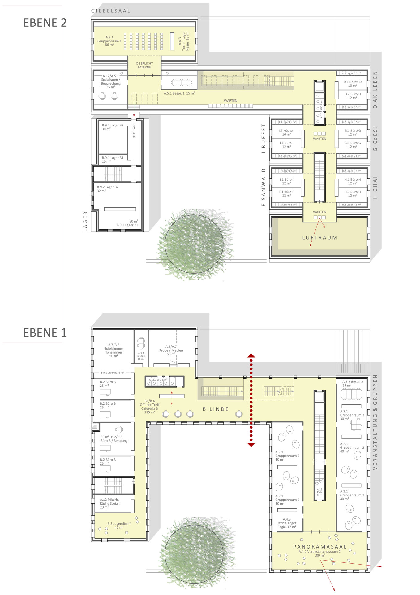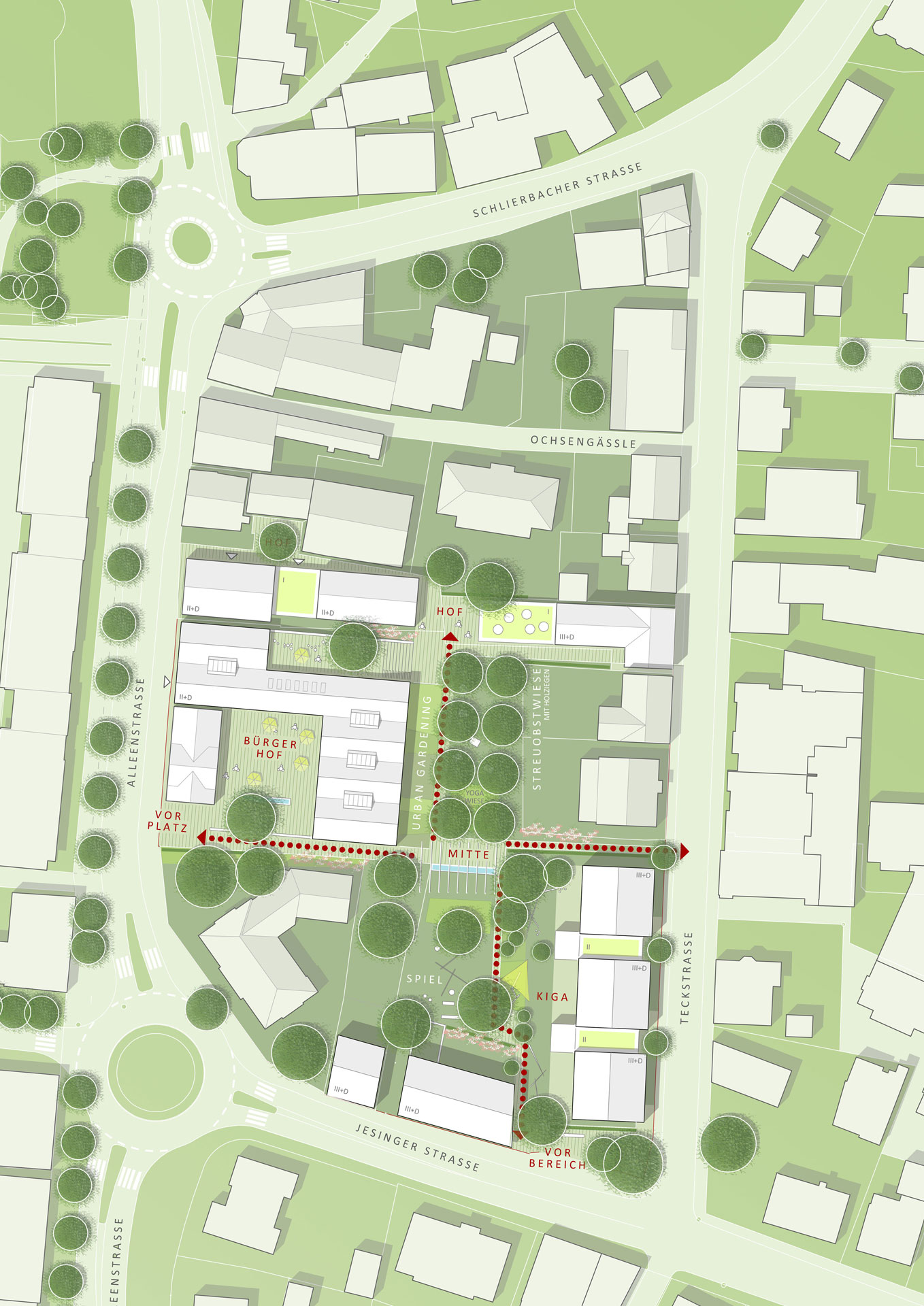 Die Eingänge sämtlicher Neubauten werden aus Gründen einer deutlichen Adressbildung in die Straßenräume orientiert. Vorplatzsituationen am Bürgerhof und im Südöstlichen Kreuzungsbereich bilden wiederum jeweils den Auftakt für das fuß-läufige Wegenetz im Blockinneren und können als Adresspunkte für das Areal gelesen werden.