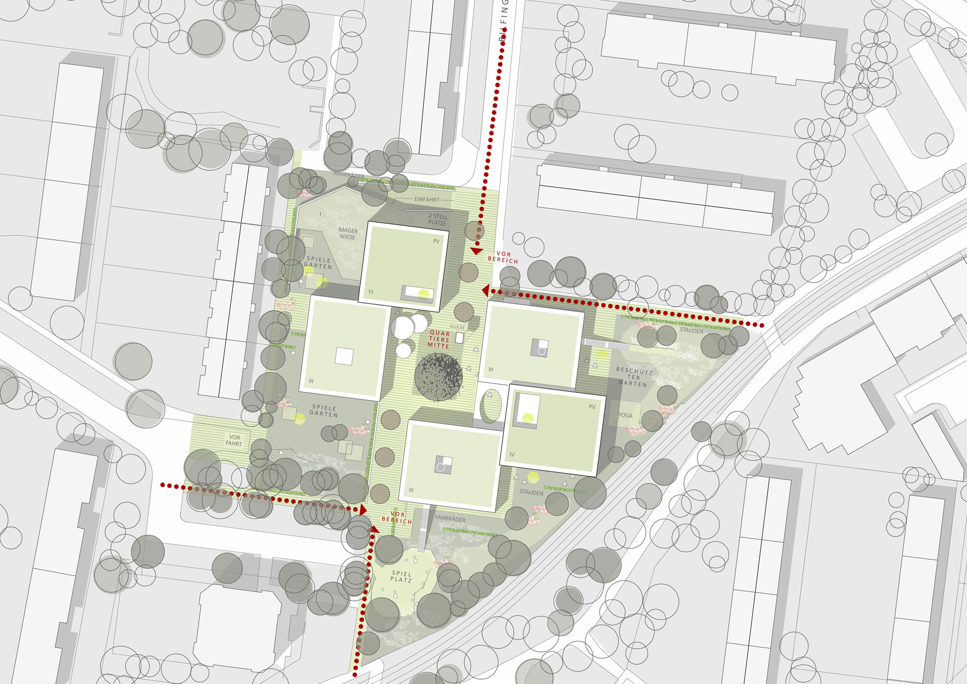 Projektbeschrieb: Auszug aus dem Juryprotokoll: Der Entwurf setzt ein eigenständiges Ensemble mit sechs kompakten Baukörpern in die regelmäßige Reihung der benachbarten Wohnzeilen. Die einzelnen Baukörper variieren den Fußabdruck des südlich gelegenen Punkthauses in unterschiedlicher Kubatur und bilden damit zwei Gebäudegruppen aus, die in ihrer Mitte eine sehr maßstäblichen Quartiersplatz fassen. Während die beiden zentralen Baukörper mit ihrer Höhenentwicklung einen baulichen Akzent zur gemeinsamen Mitte setzen, staffeln sich die anderen Gebäude im Übergang zur Nachbarschaft ab.