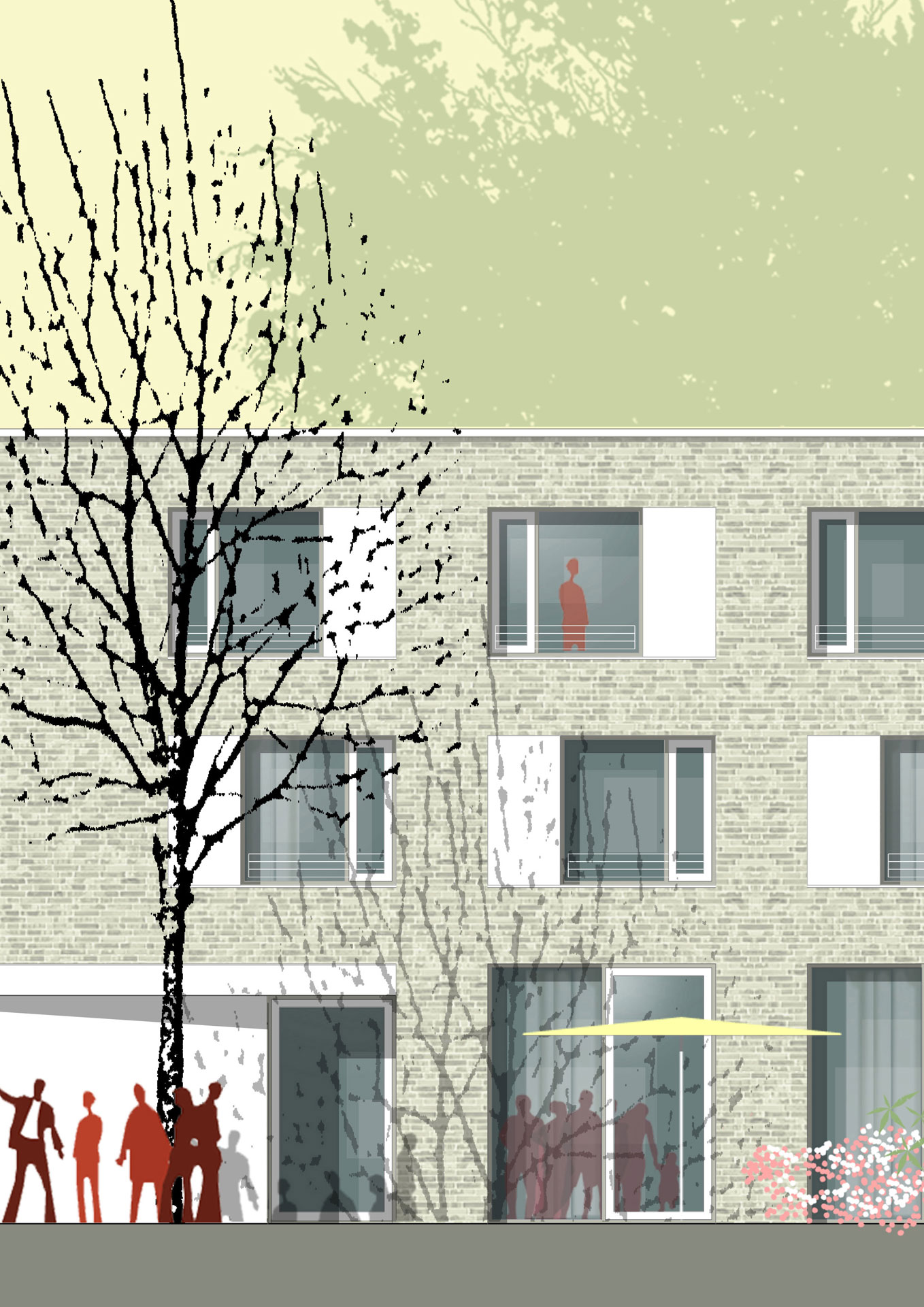 60 Betreuungsplätzen werden überzeugend in den Obergeschossen um einen Erschließungskern organisiert. Auch hier wird wieder das Thema der Loggien aufgegriffen, um den Kontakt zum Platz zu stärken. Die Tagespflege befindet sich im Dachgeschoss und hat neben einer mittig organisierten Dachterrasse auch ein Freisitz in Richtung Grünraum. Einläufige Treppen gewährleisten den Brandschutz und verbinden die OG mit den Freianlagen im Osten.