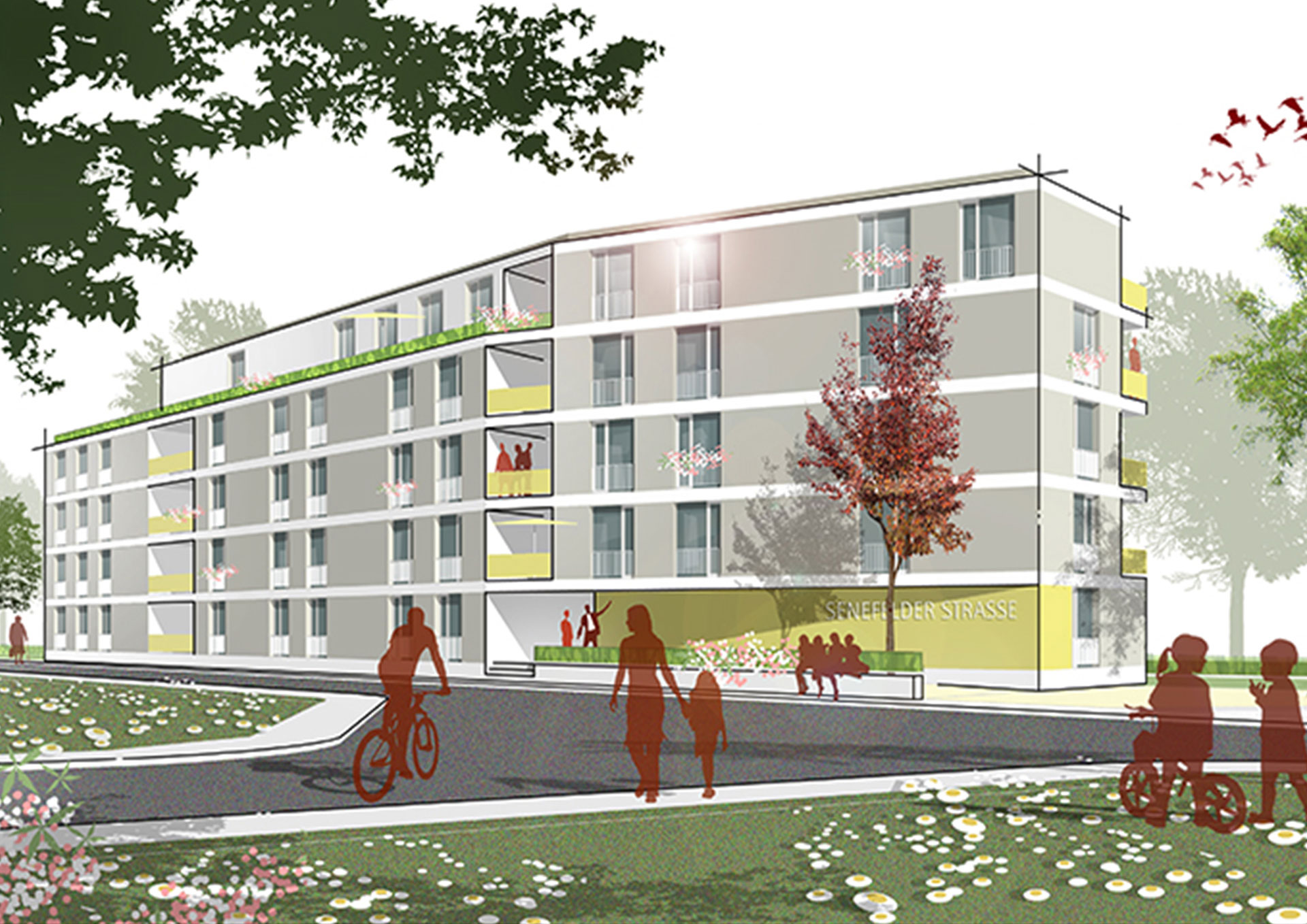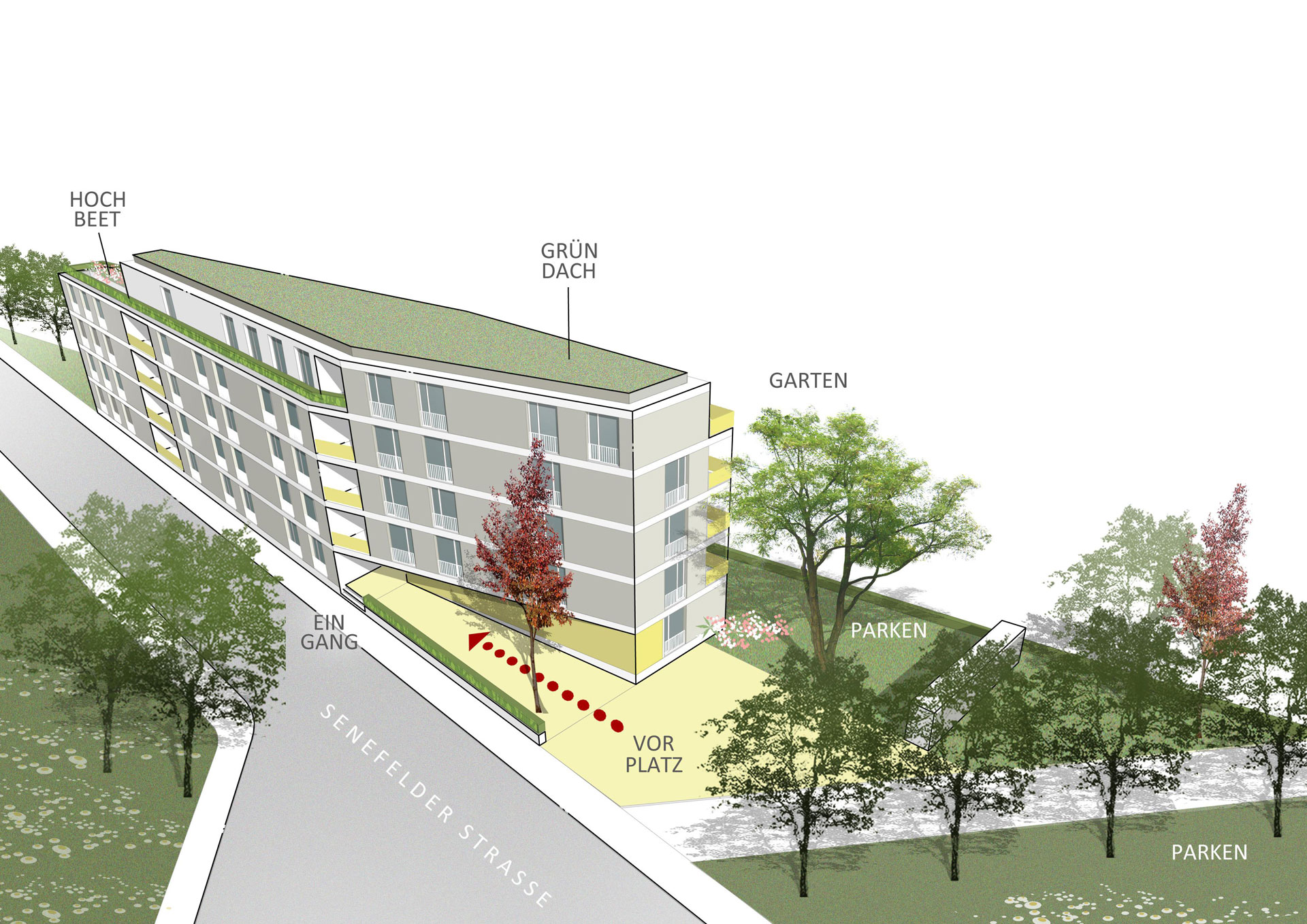 Projektbeschrieb: Ein polygonal geschnittener, viergeschossiger Baukörper vernetzt sich im spitzwinklig verlaufenden Grundstück an der Senefelder Straße.