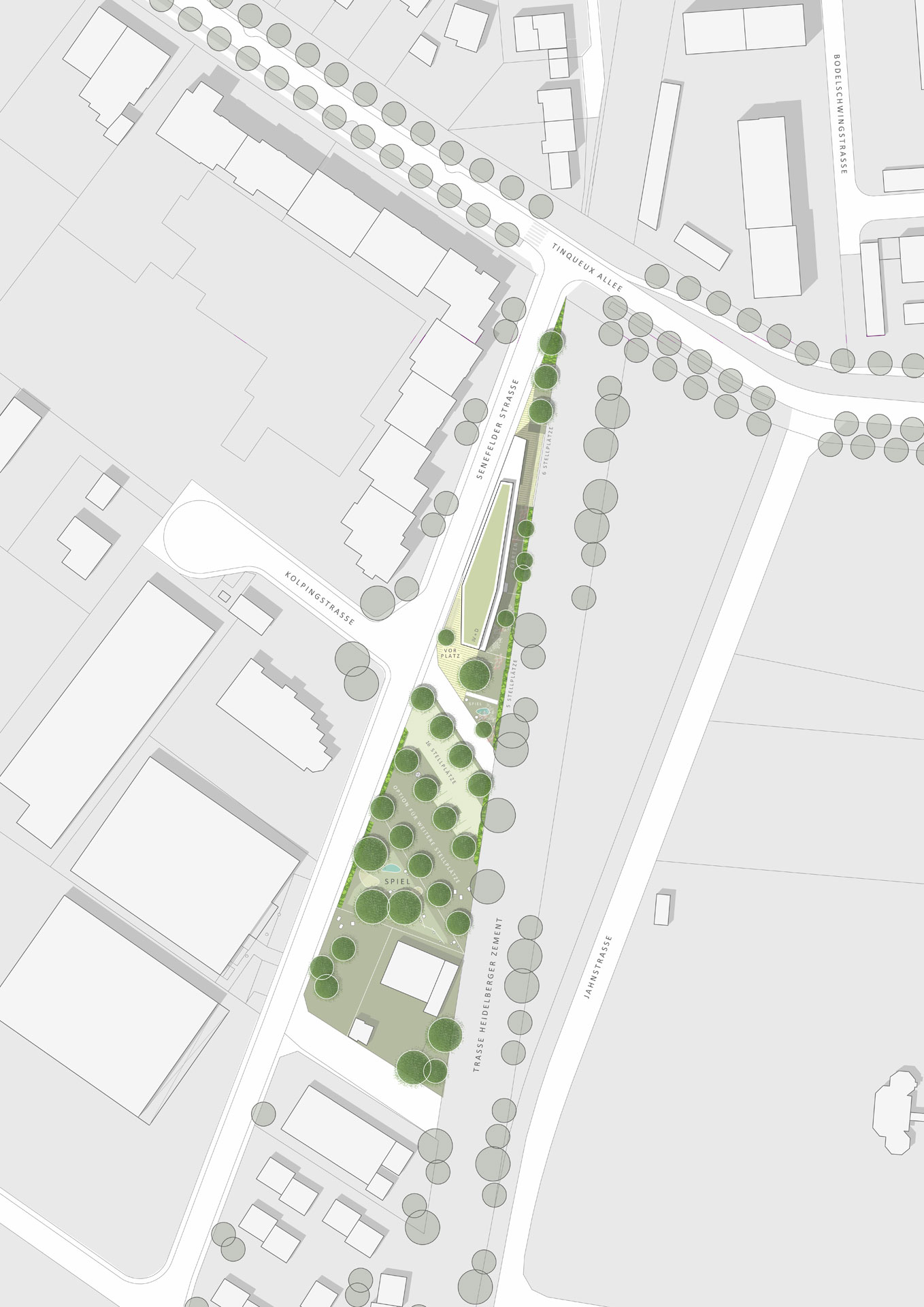 Es entsteht ein Gebäude, welches das Grundstück im Rahmen des Bebauungsplanentwurfs in hohem Maße ausnützt und sich im heterogenen Umfeld mit einer selbstbewussten, eigenständigen Sprache behauptet.