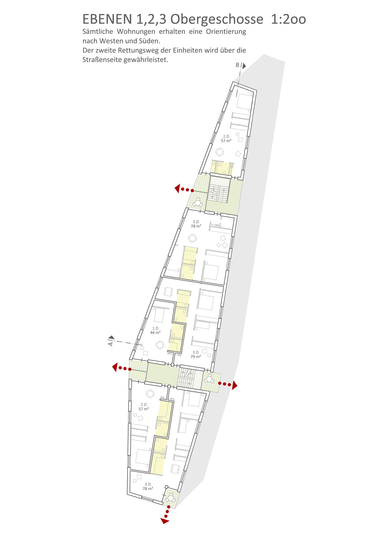 Ein Staffelgeschoss akzentuiert die südwestliche Ecke und tritt straßenseitig und zur Nachbargrenze unter Berücksichtigung der erforderlichen Abstandsflächen hinter die Fassadenflucht.