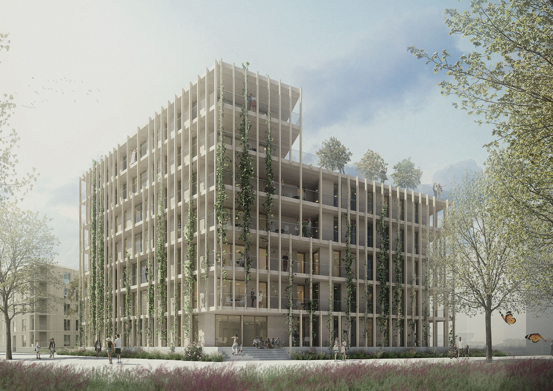Projektbeschrieb: Das neue Wohnhaus hebt sich aus der umgebenden drei- bis viergeschossigen Bebauung durch eine Überhöhung auf fünf und sieben Geschosse hervor. Ein allseitig von Holzlisenen flankierter offener Umgang bietet dem Neubau eine begrünte Übergangszone zwischen Architektur und Außenraum. Die luftig anmutende, begehbare Hülle verleiht dem Gebäude eine angemessene städtebauliche Präsenz und betont durch die Materiali-tät und erdgebundene Rankbegrünung die ökologische Grundhaltung des Projekts. Insgesamt werden auf den sieben Geschossen 30 Wohneinheiten mit einer Wohnfläche von 1860 m² sowie ein multifunktional nutzbarer erdgeschossiger Raum mit 40 m² Nutzfläche angeboten.