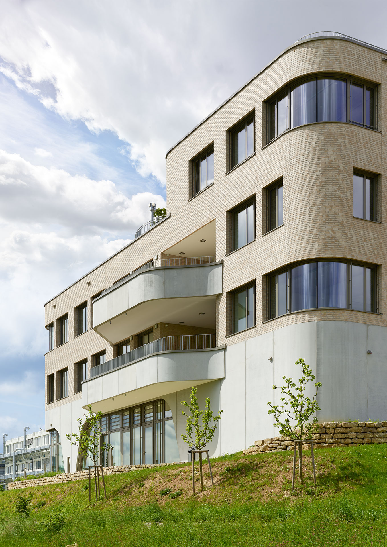 Projektbeschrieb: Forschungs- und Entwicklungszentrum mit öffentlich nutzbaren Mehrzweckbereichen im Erdgeschoss. Das Gebäude ist als großer, skulpturaler Bau konzipiert, der bewußt rückwärtige oder abseitige Lagen vermeidet. Ziel ist es, mit allen im näheren Umfeld ansässigen Firmen in Kooperation zu treten. Von Bedeutung sind hierbei der sich direkt zum Platz orientierende Haupteingang, die großzügige nach Osten orientierte Terrasse mit herrlichem Blick zur Schwäbischen Alb.